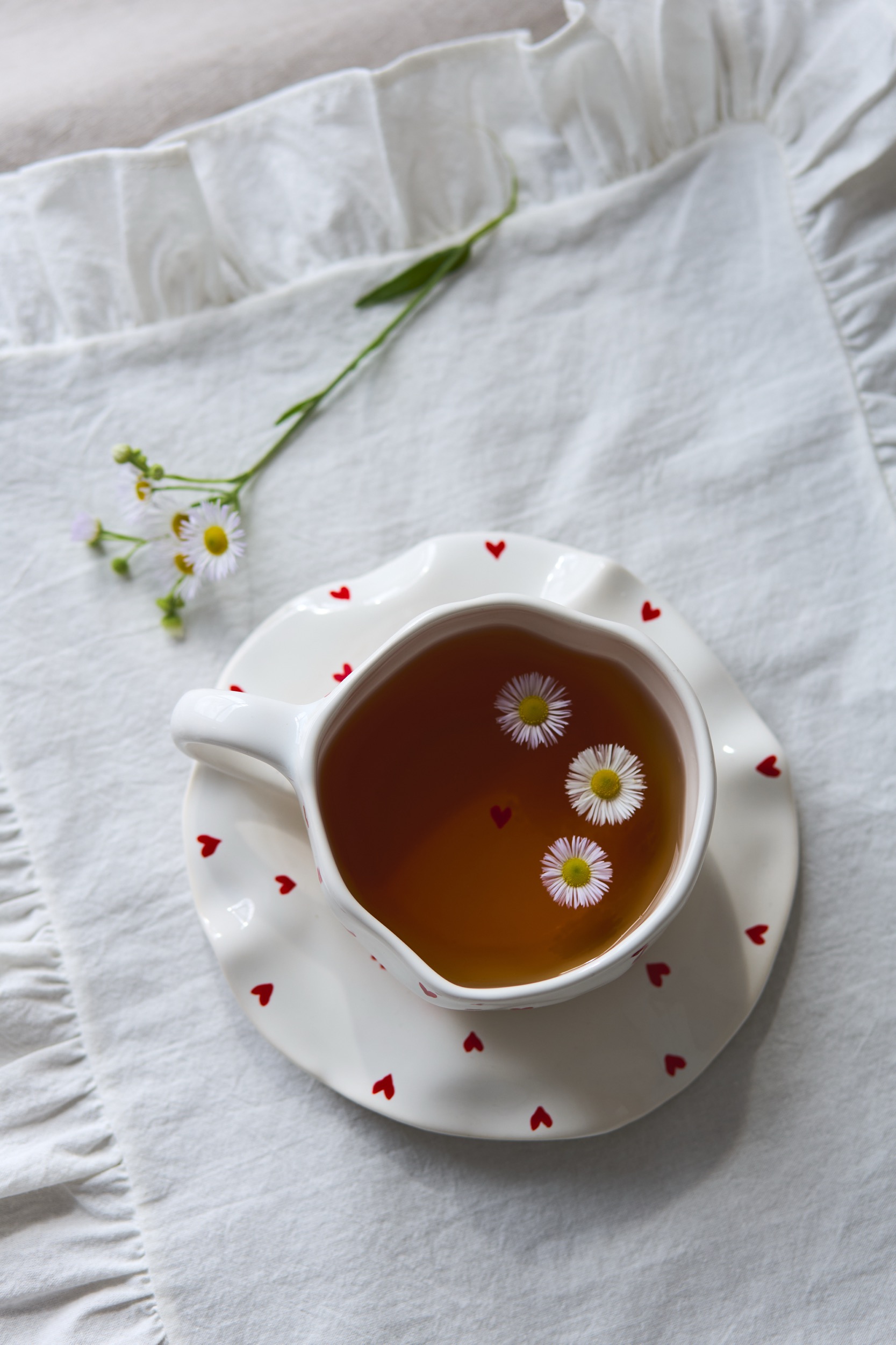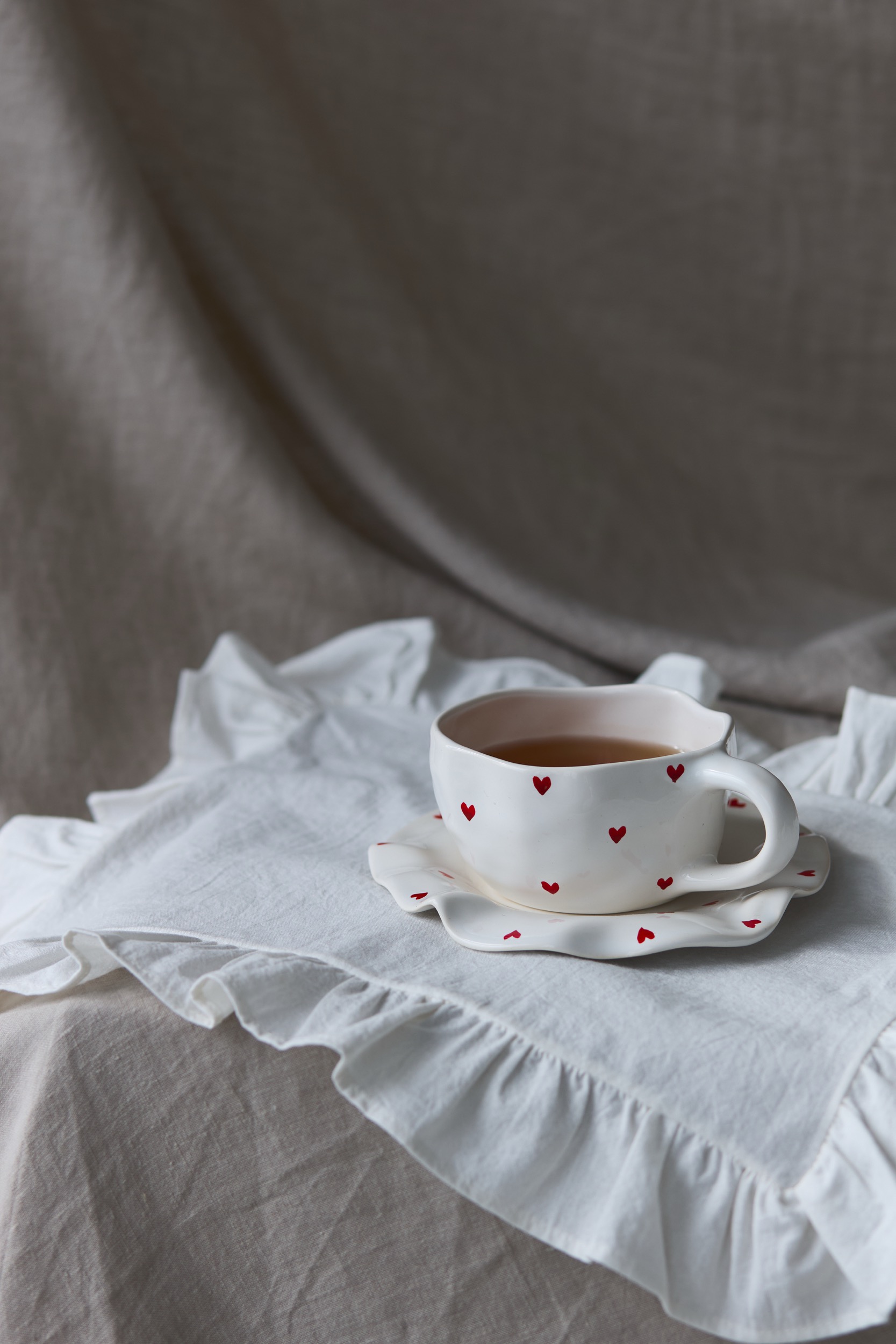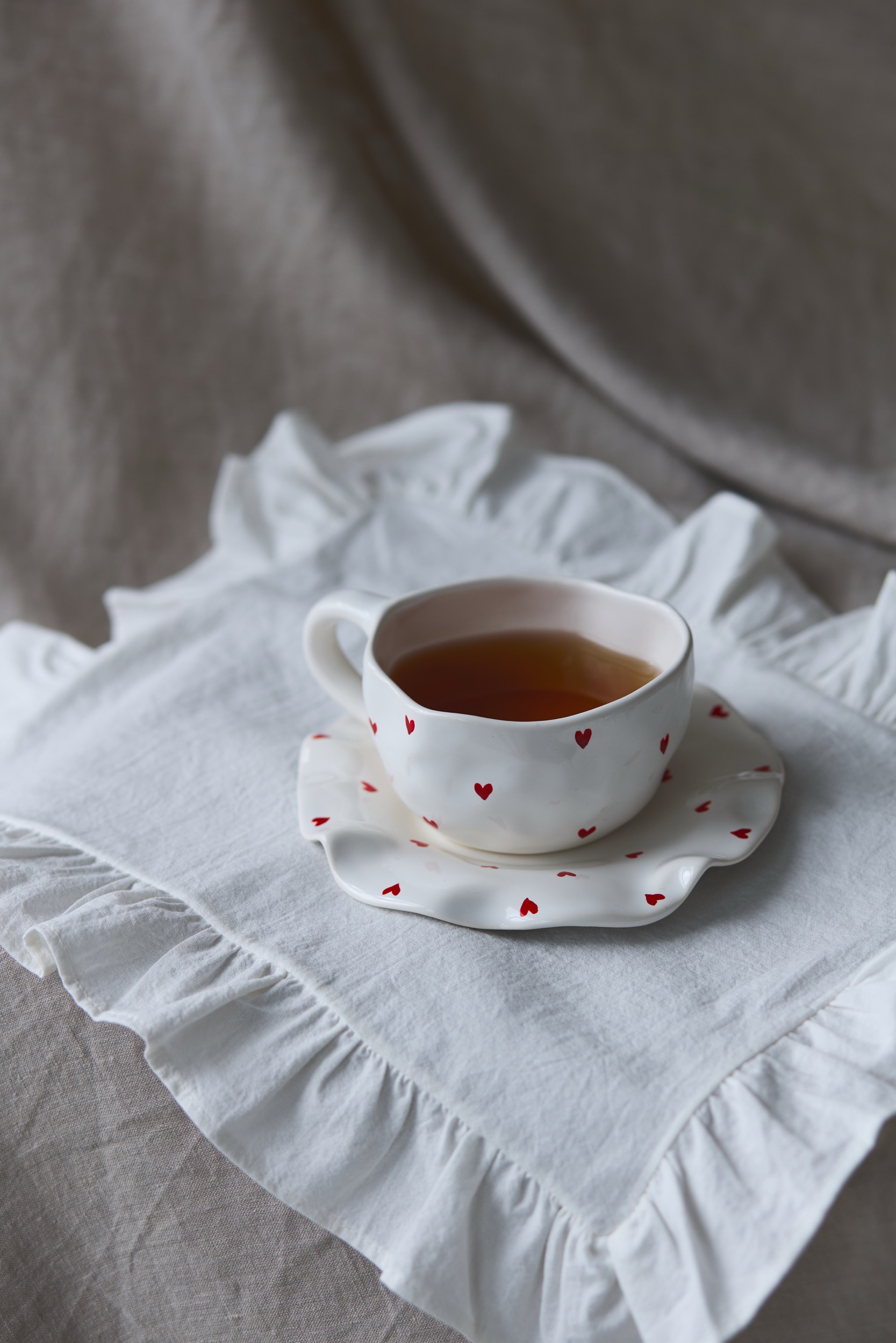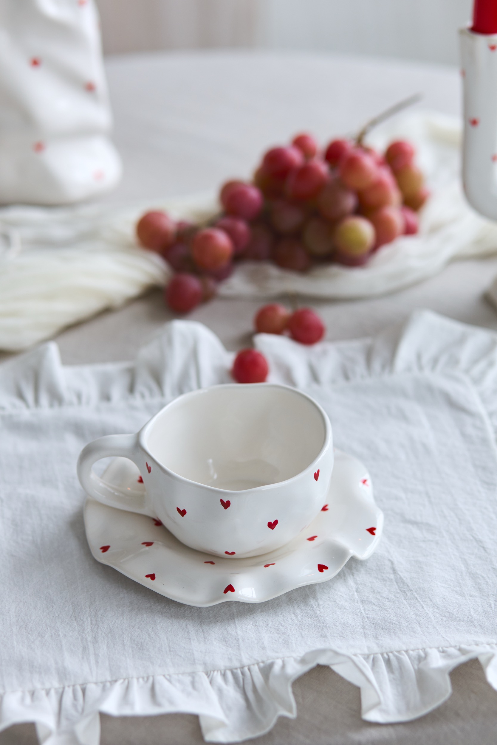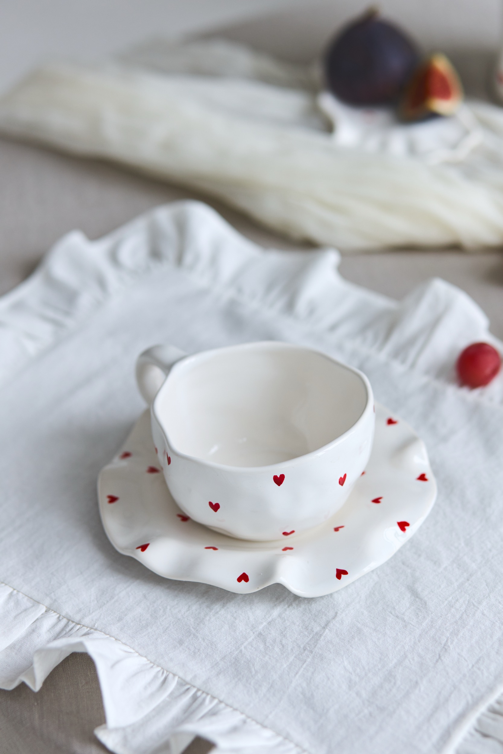 Жива форма чашки приємно лежить у руці, а хвилясте блюдце додає композиції м’якості та шарму.