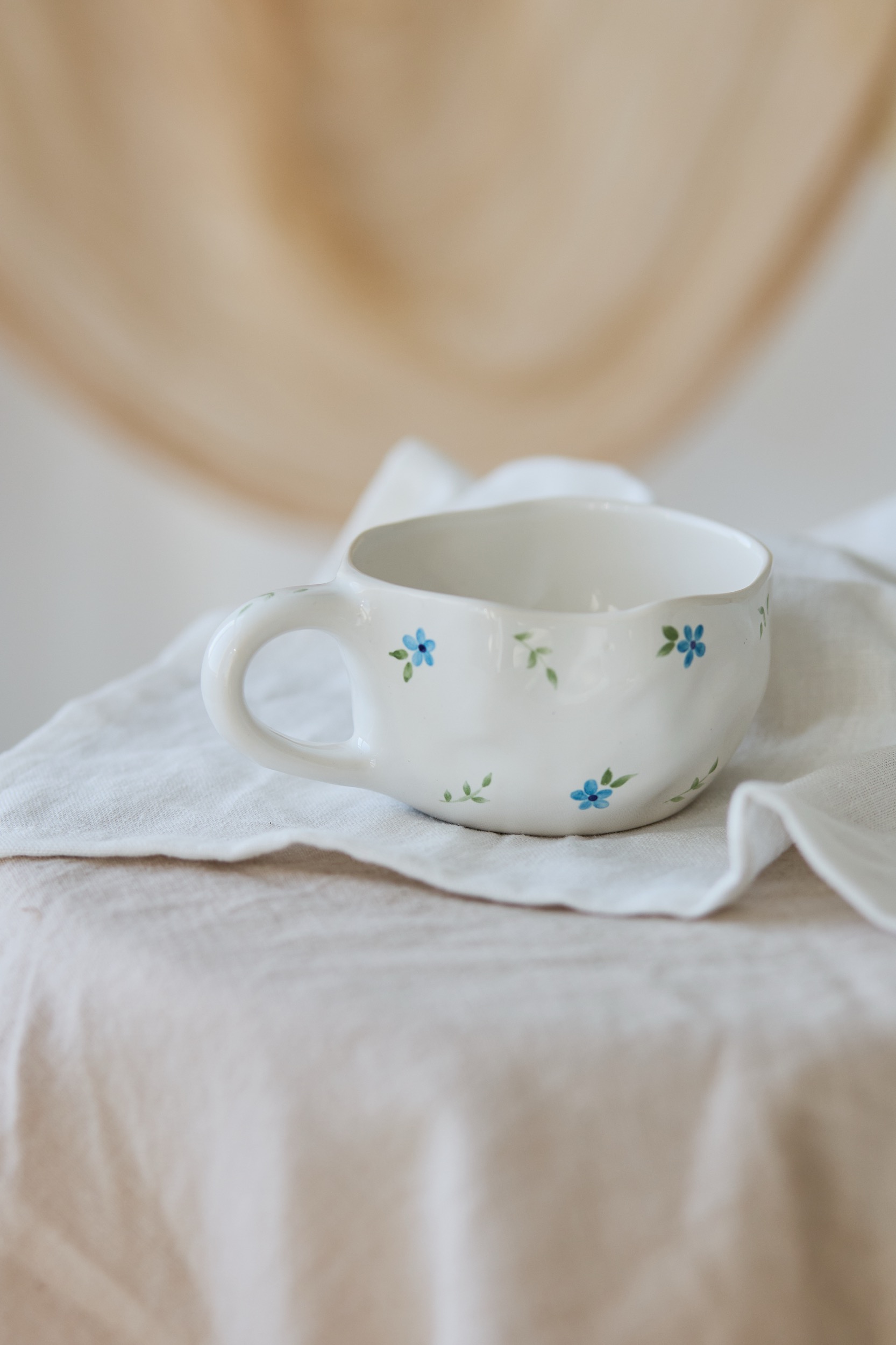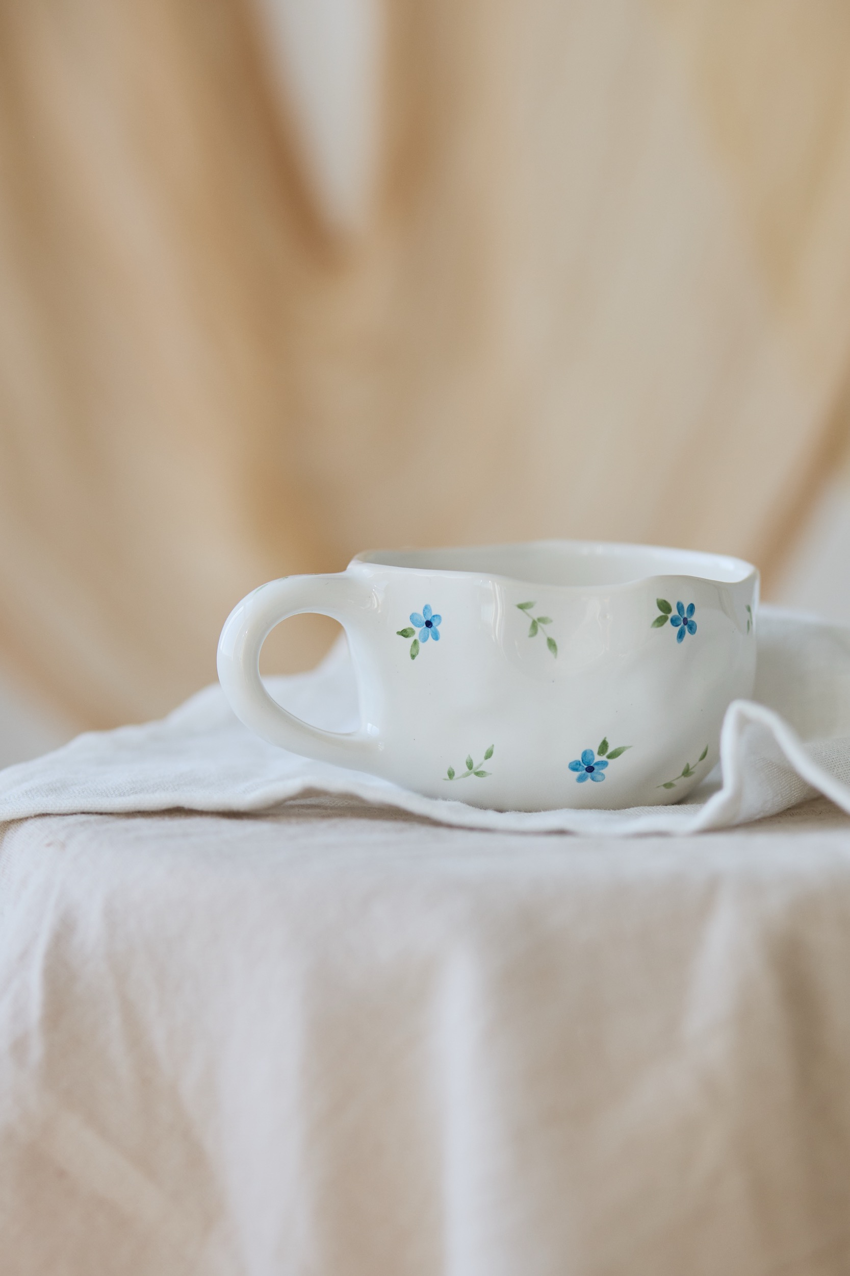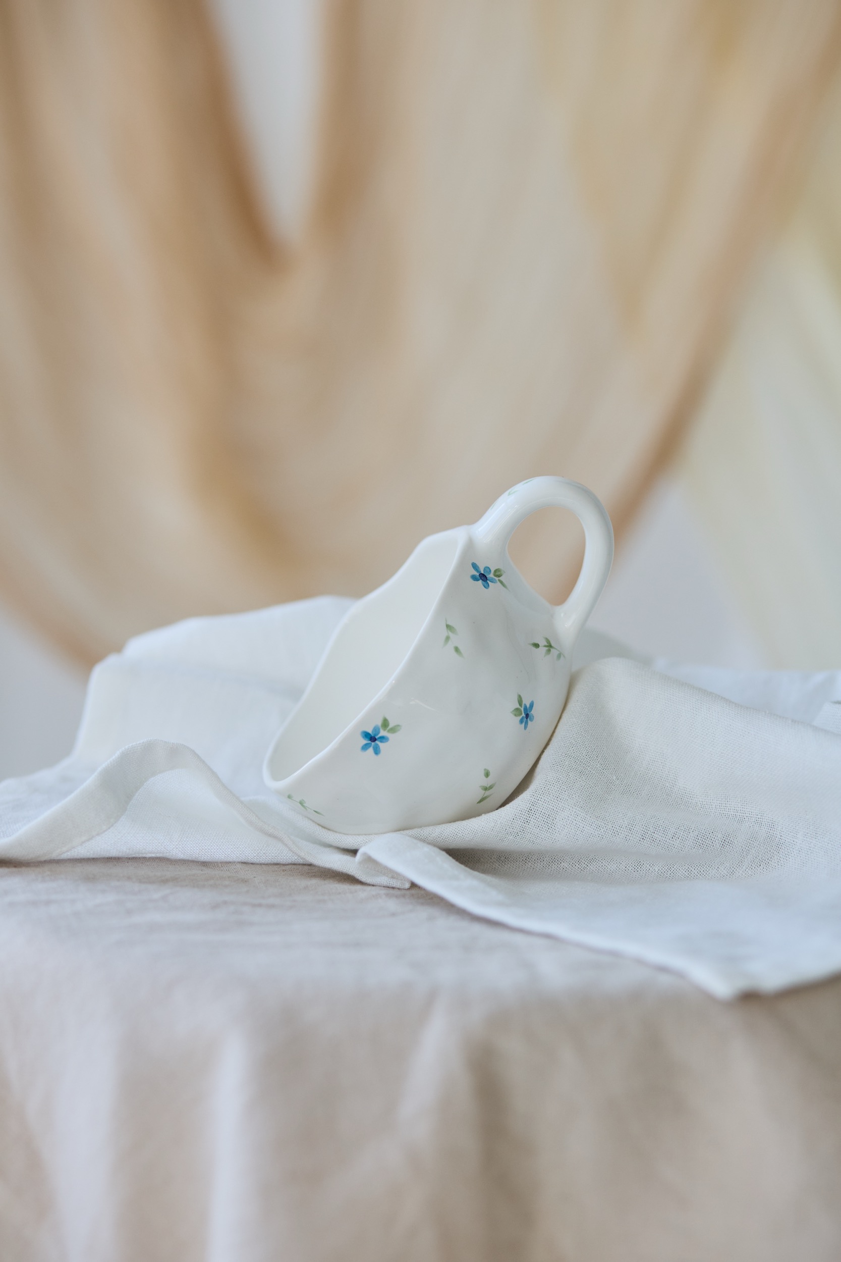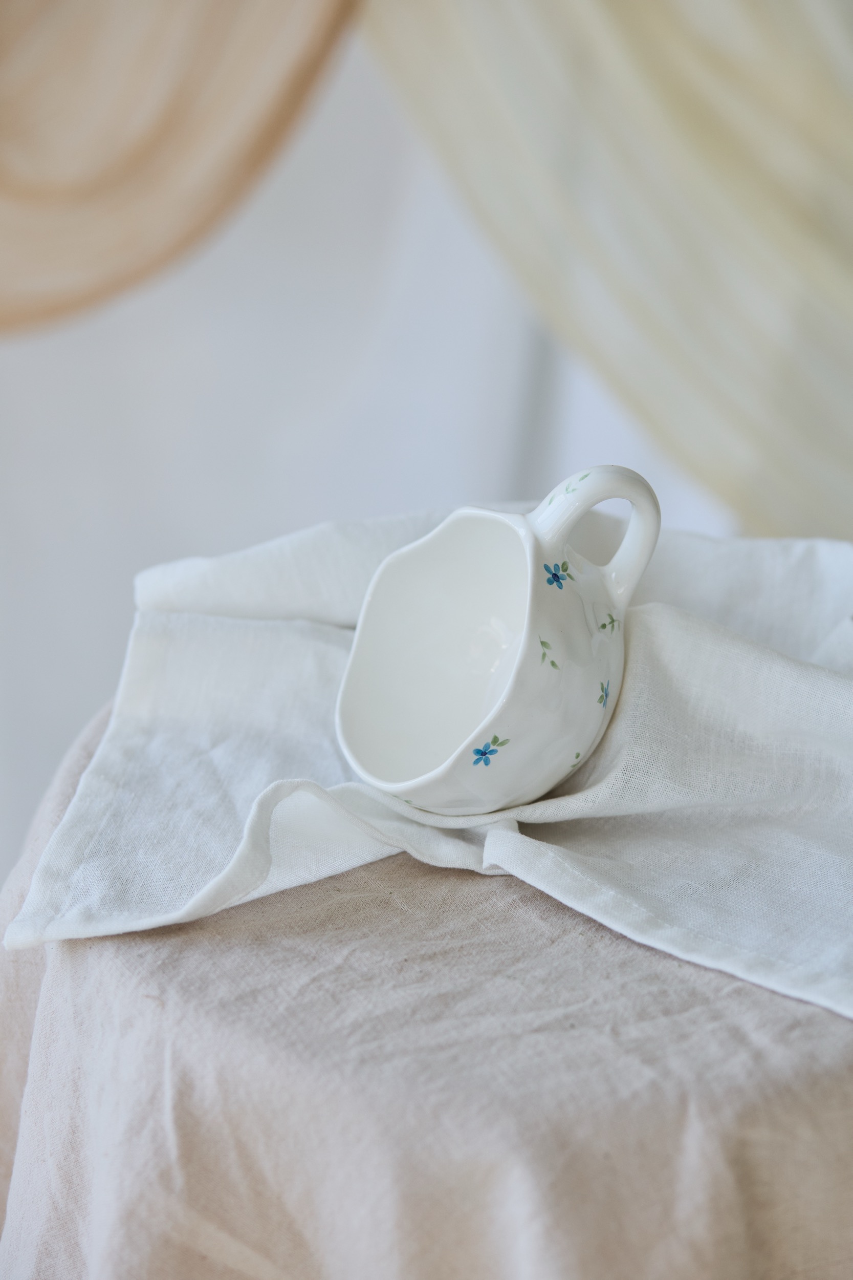Ніжний ручний розпис із маленькими блакитними квітами нагадує про перші промені сонця, що торкаються роси.