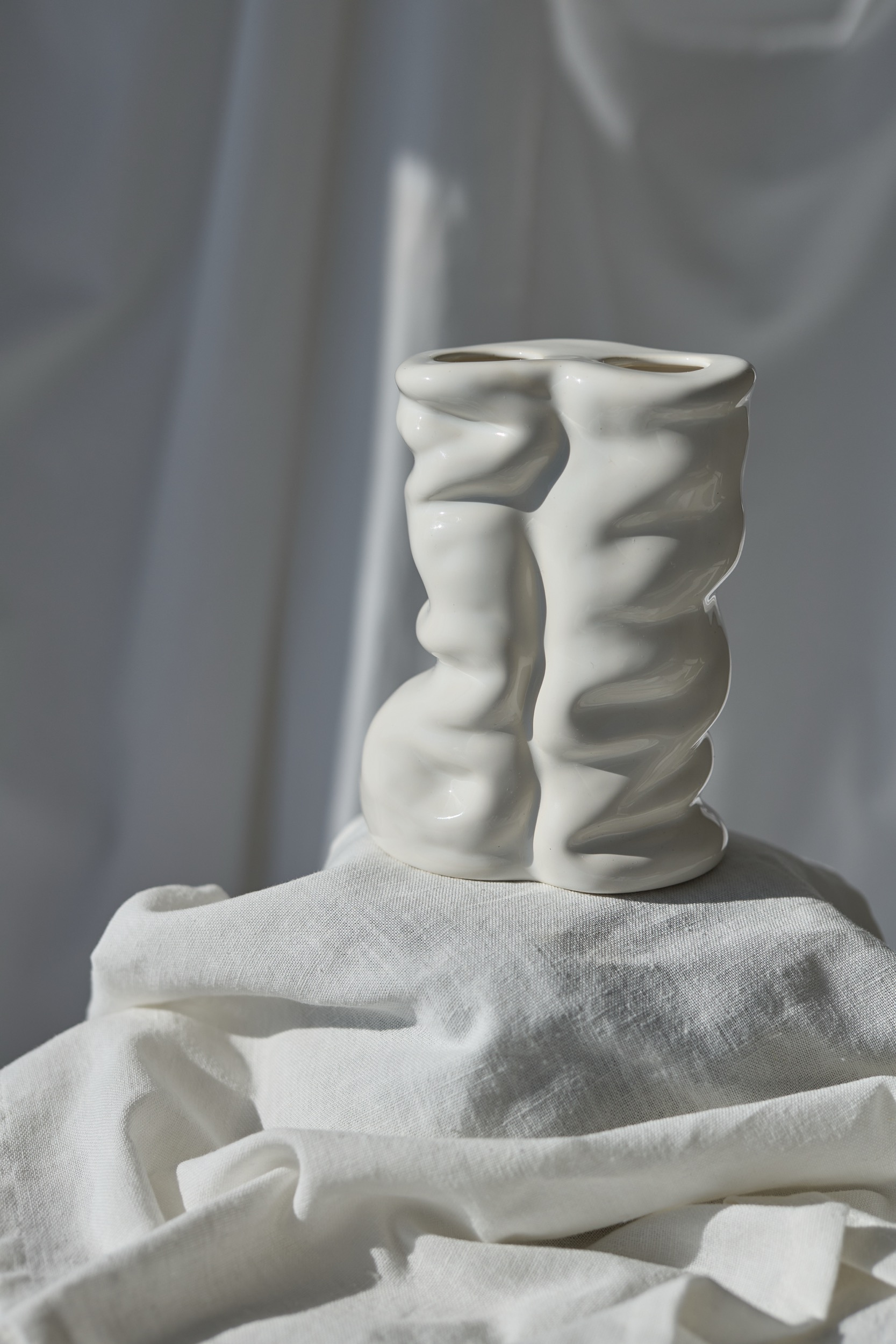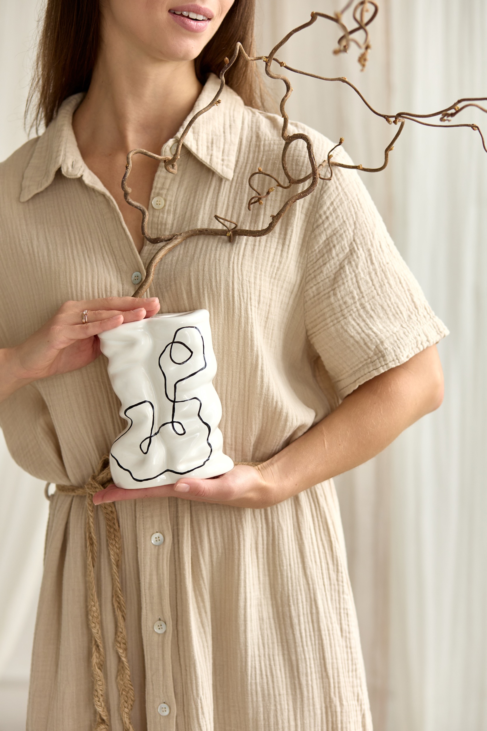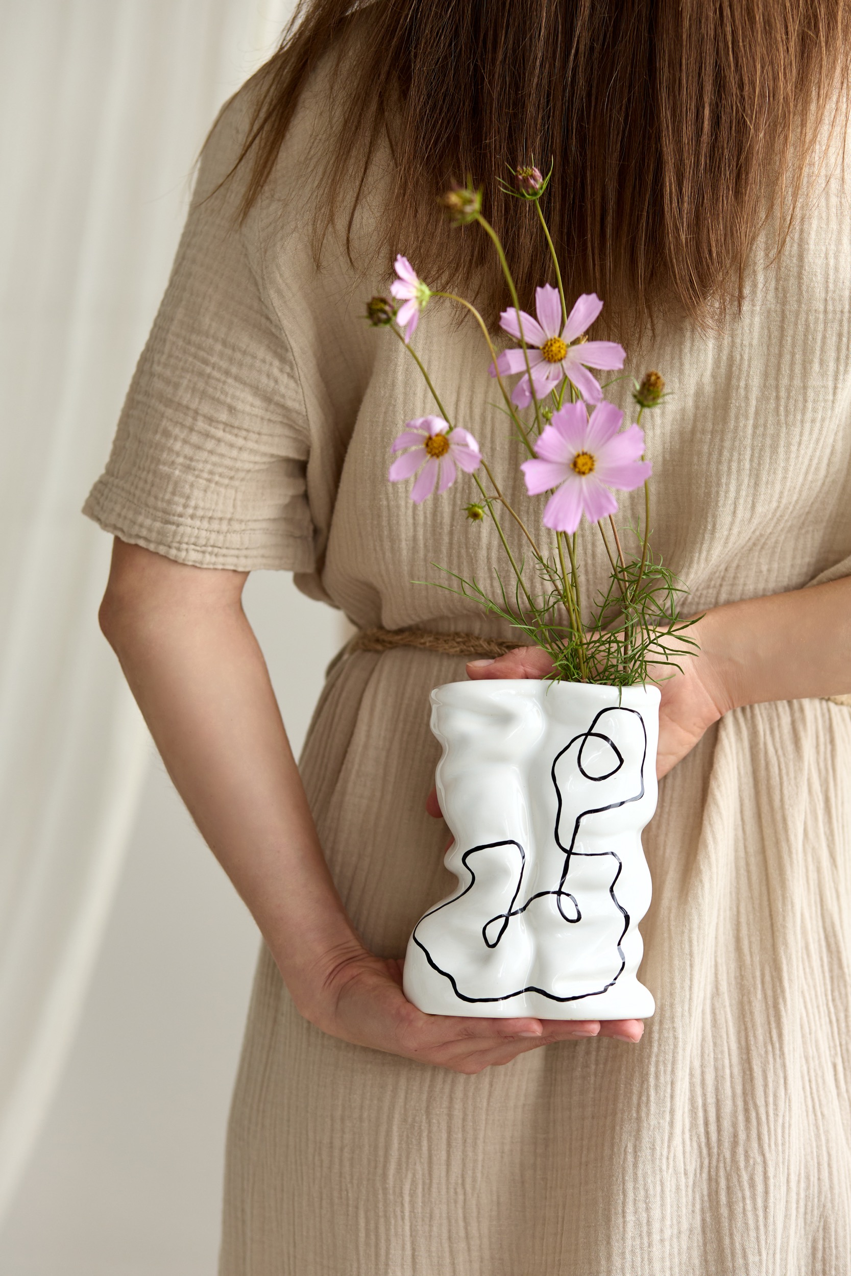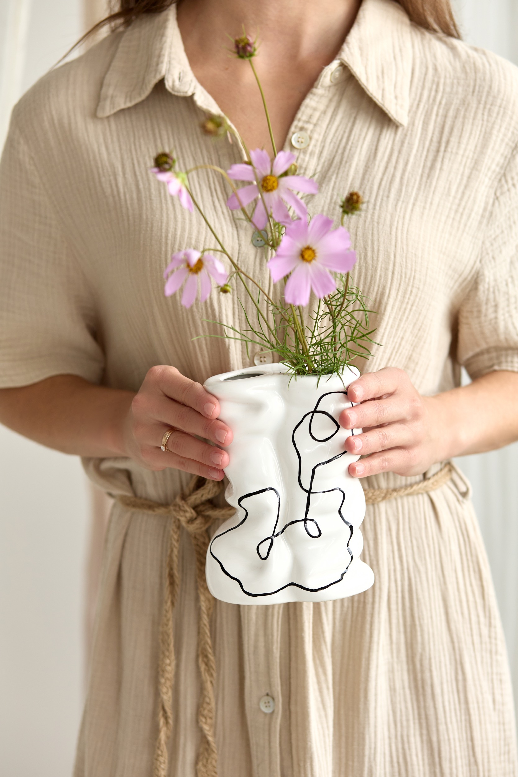 Ваза “Arco” — це поєднання пластичної форми й графічної лінії. Її асиметричні вигини нагадують про рух, а чорний контур, нанесений вручну, додає сучасної виразності.